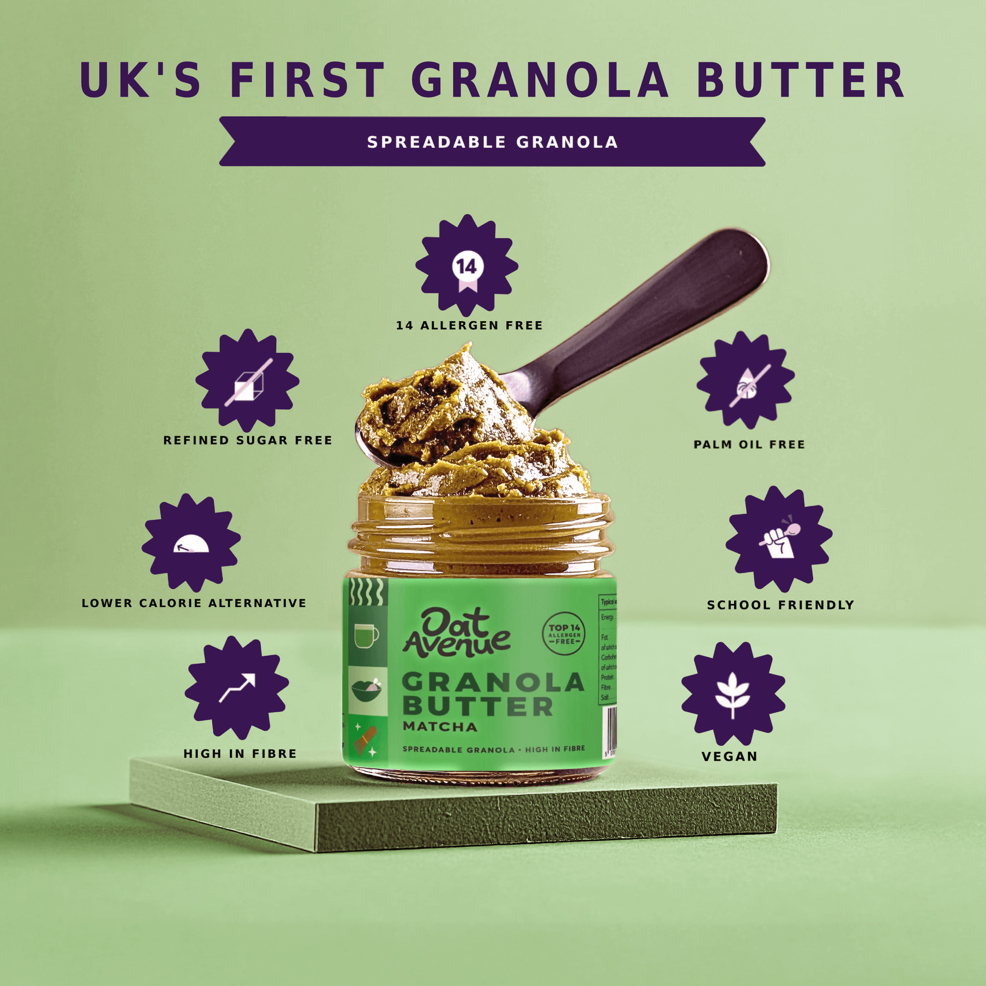 Matcha Granola Butter Ingredients: Gluten Free Oats, Organic Coconut Sugar, Sunflower Oil, Organic Match Powder, Sea Salt